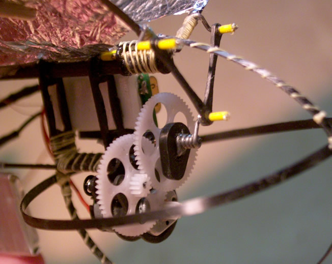 | More pics of the mech. You need to build these like a heli in terms of resilience etc. But that is no so easy at these sizes. Another modification made after the original build was to put 1mm carbon rods between the two plates that make up the gearbox around the locations of the bushes. This prevents the plates pushing together in a crash causing problems with bearing alignment. You can see the double crank quite well here, it allows you to adjust the flaps of each wing but to be honest I left it as I originally made it and used a bit of bluetac on the wing tip to stop the model turning sharply, a suggestion of John Mack. | |||||||||||||||||