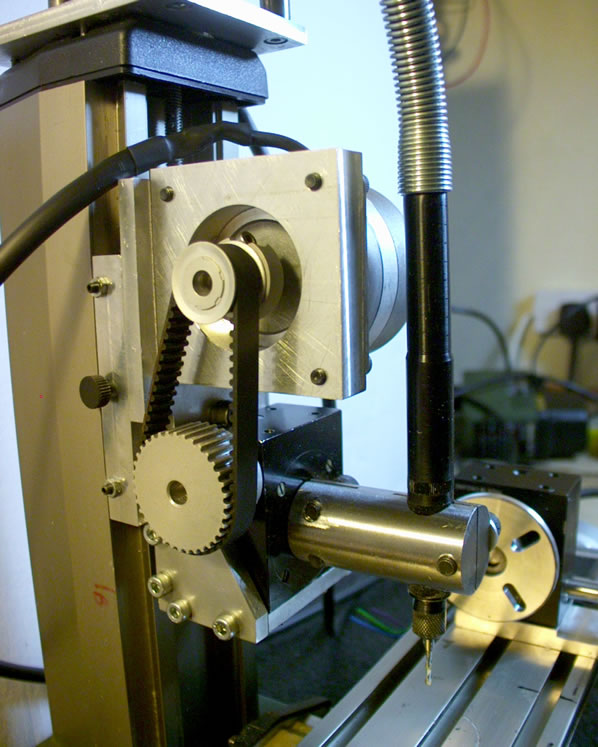 Problem 2: The proxxon spindle is quite a lump and one piece as I mentioned. There is no way I could rotate it even if I wanted to. The required table would be far too heavy and the whole thing just too big for the mill. I thought about other spindles and there are not all that many possibilities at this size if you don't have much cash. I had an old battery operated mini drill that I considered for a time (I would have powered it from a PSU) but it has no oomph and the bearings are poor. I also considered my dremel but this too is surprisingly heavy so it would need quite a hefty rotary table with the associated weight. Then I remembered the useful if seldom used accessory: the flexible shaft. This can deliver the full Dremel whammy but it really doesn't weigh anything. Perfect I thought so the plan was hatched. The first thing required was a rotary axis, now strangely enough before this project really got started I had been day dreaming about a 5th axis. This is what happens when you build a 4th axis. I thought to myself all I need is another small gearbox like the one on the 4th axis and a light weight spindle and I am there. Then something weird happened, now bearing in mind that the first gearbox was taken from a surplus aerial tuning unit bought at a radio rally when I walked into my place of work and saw a box of junk waiting to be chucked out the last thing I expected to see was an identical gearbox, only 30:1 this time but the same size and made by the same people. Well it was fate or perhaps I always dream about a 5th axis and am lucky not to work in a burger bar. I don't have any intermediate photos so I will have to go straight to the money shots |