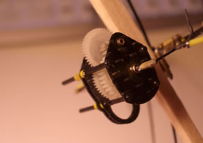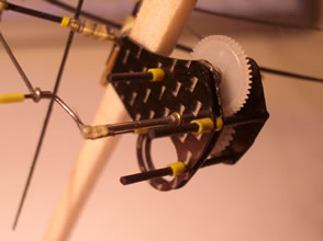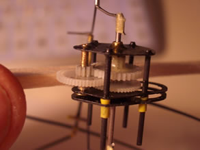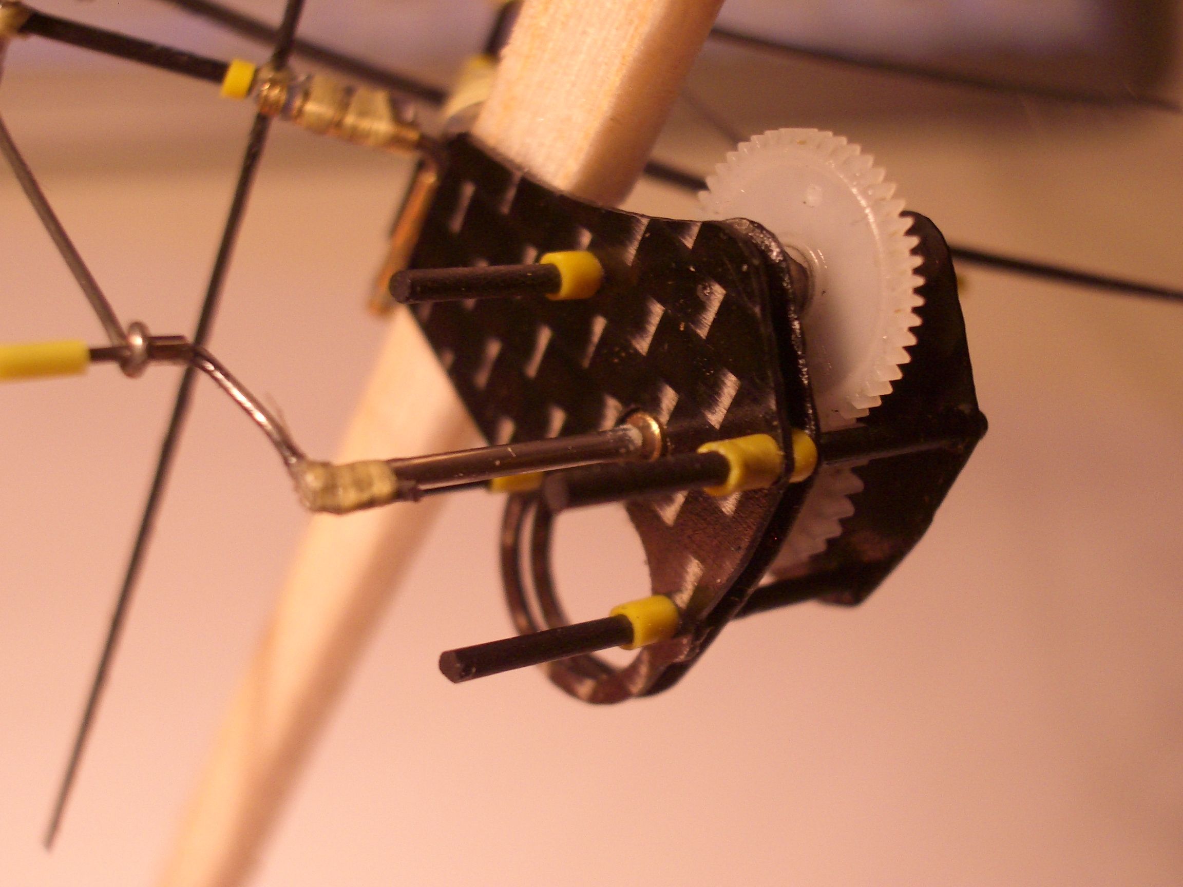 The gearbox is constructed from 0.2mm thick carbon fibre plate and 1mm carbon rods. The motor is not shown and the motor holding tube is also not in place.