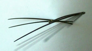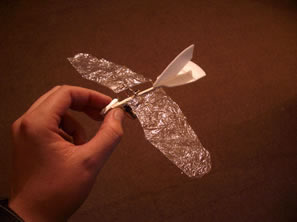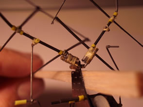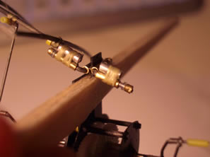 The shoulder hinges allow rotation of the wing and flapping but at the moment no sweep forward. Brass tube and wire are used for the hinges. Teflon tube is used for washers and short lengths of brass used as retainers. The wire is cut to provide a burr that also retains the brass tubing. The wings push into ali tubes at the moment.
