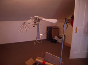 I do not suggest that scientific measurements can be taken from this set up however it is interesting to watch. The upright is from a broken lamp and the central bearing from a video recorder. The arm is 2mm carbon and the counterweight a pair of pliers. The model simply clips onto the top of the balsa upright and can propel itself around a circular path. To my suprise it picked up quite a speed but of course it is not supporting it's own weight. Further modifications to the rig could be made to allow more meaningful results but for now this video is enough.