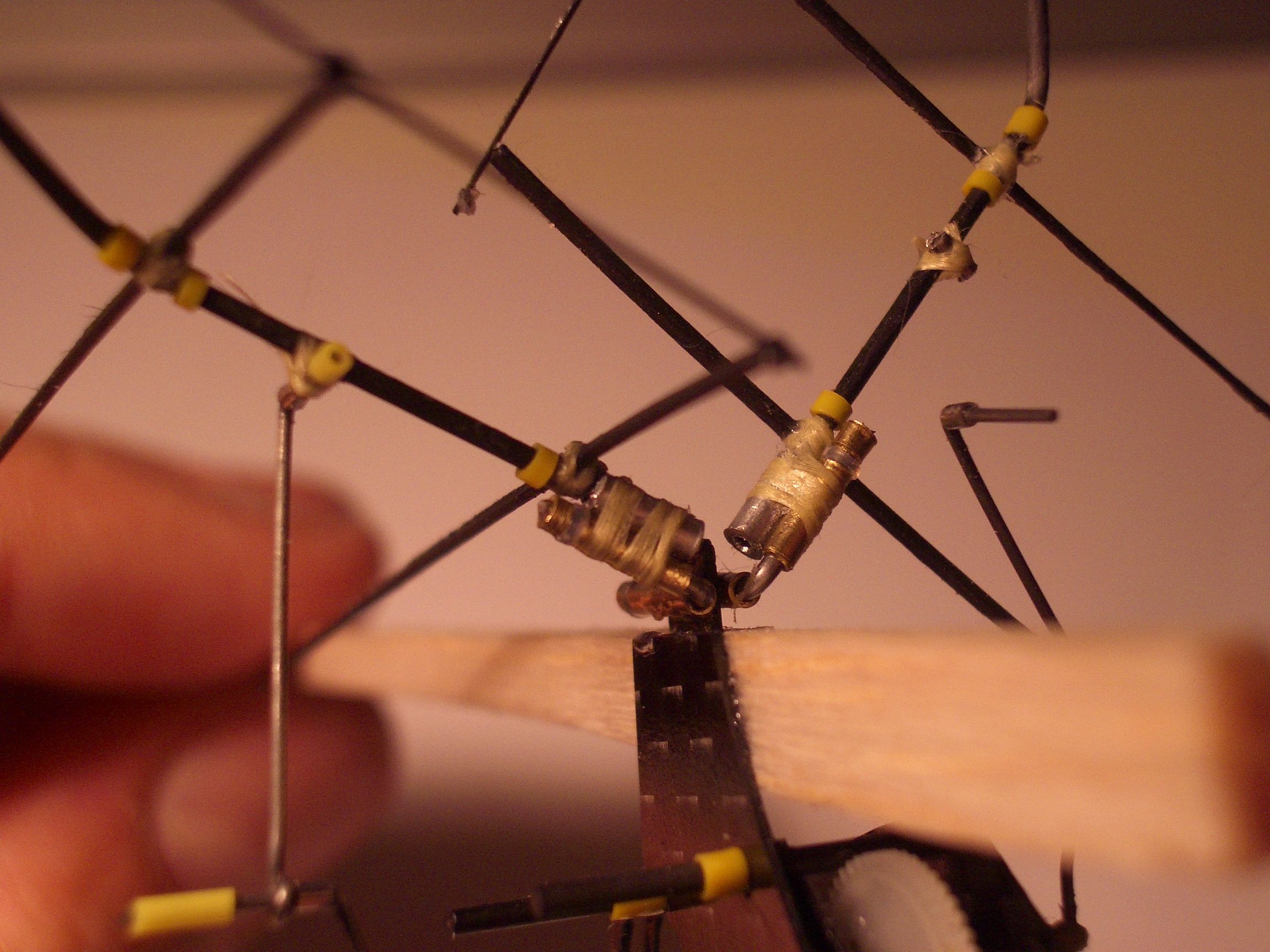 The shoulder joints again, the left wing is disengaged from the conrods. The L in the crank produces the twist in the wing during the flap..