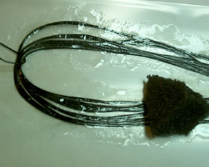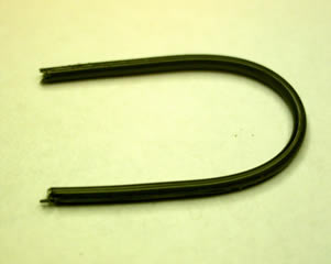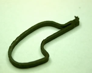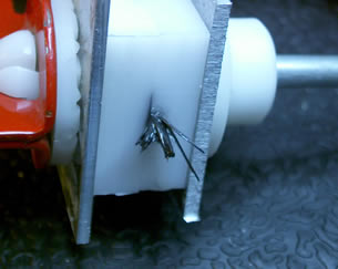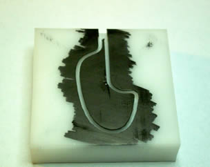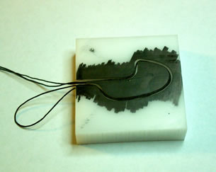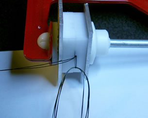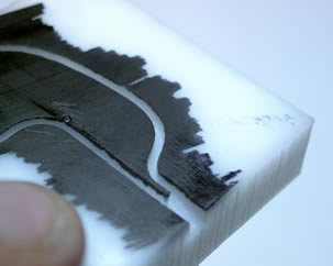 Left, wetted carbon tows pulled through fuel tube with Kevlar thread. Right, after curing in oven. Left, close up of rod, some sanding shows a little too much surface epoxy. Making an ornithopter bumper with a delrin mould. Above left, CNC cut mould. 1mm cutter, 2mm deep slot. Black marker to make cut visable for photo. Right, strong thread doubled over and placed in mould. Was wetted a little to keep it in place. Above right, Another delrin plate was used for the top of the mould, then aliuminium stiffeners were added and the whole thing clamped. Doubled over tows are threaded through the pulling thread. The number of bunches determined by tial and error. Above left, the tows were wetted out on a platic sheet, a piece of foam (and a glove) used to apply the laminating epoxy. Above right, after pulling the carbon through the excess was trimmed. After baking for 15min at 50degrees C the mould was broken apart and the piece removed. No release agent was used but it would have made it easier. The part was then cooked for a further 10min at 100 degrees C to really set it good!. Above right, the finished part after finishing, the part was trimmed and sanded to give a taper to the tip. Conclusion: Carbon is fun, The bumper needed more tows and a thinner pulling string. Release agent would have helped with the delrin mould but suprisingly was not absolutely required. |