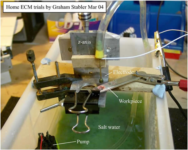 By chance I found a company on the net that make EDM and ECM machines. I knew what an EDM machine was (electrical discharge machining) but ECM was new to me. Apparently it could be used to form 3D objects in hard materials and also for drilling really long holes. One example is that of drilling holes down the length of turbine blades. I won't go into the detail of ECM but it is basically the reverse of electroplating, you are de-plating the workpiece with by passing a current between it and another electrode through an electrolyte (can be salt water hoorah!!). To get detail you put the electrode really close to the workpeice which creates a high current density. You also insulate the parts of the electrode that are not at the "cutting edge". For deep holes they even use glass tubes with a wire down the middle. The current flows out of the tube dissolving the surrounding area. If the gap is kept small the hole is also precise. The main important things in ECM seem to be: 1: A small gap, to get the required accuracy. 2: Clean electrolyte, it needs to be filtered (unlike mine), why? see 1. 3. Good gap flushing, see 1 again. To keep the gap free of debris they electrode used for holes is normally a tube, the fluid is pumped through the tube at high pressure to ensure the gap is constantly flushed. For dies, there will normally be a set of holes for flushing or I think they may flush though gap from one side to the other but now I am guessing For more details see: http://www.unl.edu/nmrc/ECMoutline.htm My test rig is just a simple manual set up based on my trusty adjustable PSU with 1.5 amp current limit. The electrode is a brass pinion gear soldered onto a length of brass tube. This is attached to the end of some PVC pipe that allows the salt water to be pumped from the reservoir though the electrode and between the gap. The pump is just a windscreen washer pump, quite powerful but doesn't fight against back pressure much, might need something better later. The z axis is just a small hand operated stage and the workpiece is a scalpel handle (no good reason why). The electrode was insulated on it's sides with 5min epoxy and this was the downfall of the experiment, it flaked off so there was a lot of erosion going on on the sides of the electrode during machining. That is why the hole is more of a flower than a gear. I will use high temp lacquer next time as used on copper wire etc. Should work much better.