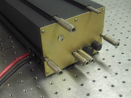 | Here she is. At about 20kg it is a bit of a whopper but the fact the cavity is metal along with the design makes the cooling pretty efficient. The whole thing is really one big heatsink. You can see the ports for water at each end. The tubes these connect to just clip into the body of the laser to take away excess heat. In fact the 25W version can be cooled by fans only. | ||||||||