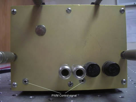| A better look at the arse end. The control signals are really very simple. 5v turns the laser on, 0v turns it off. To control the power you turn it on and off at 5khz and vary the ratio of on time to off time (the duty cycle). This is pulse width modulation or PWM. A further thing of interest is that the minimum on time should be set to 1us. This insures that the laser is always nearly on, this increases the speed at which is responds and increases the repeatability. They call this a tickle pulse. Also it is recommended that the max duty is 95% as more does not give much gain in laser power, just heat. | ||||||||