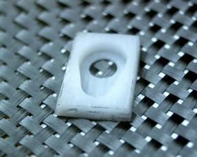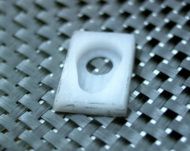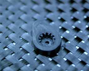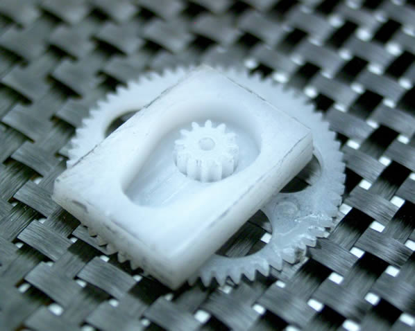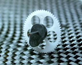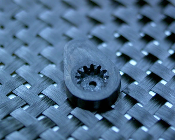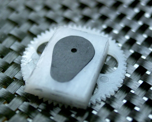 This part is for my 12" RC ornithopter. The idea is that the crank wire engages with it and it in turn engages directly with the small gear on the front of the spur gear used. Here is the mould, CNC milled from Delrin The Didel gears are also Delrin and this is inserted into the back to finish the mould and provide the form for the internal teeth. Here is the part after moulding. Moulding involved the careful placement of epoxy wetted tows into the cavity such that I had tows running around the perimeter. Once I had as much of these in place as I could manage and mixture of chopped carbon tow and epoxy was pressed into the cavity. It was generally piled up so there was hopefully much more carbon that could fit in. A Delrin block was then clamped on top with a heavy duty clamp and the whole thing baked. The clamping and some of the general pressing ensured that the excess epoxy was squeezed out Here is the finished part in the mould this is after some gentle cleaning. The hole was not moulded in either but just drilled using the gear as a guide. This is the finished part, it looks just as good in the flesh, you could even see the machining marks on the other side and also the evidence of the way the tows were laid up. This is the top where most of the carbon is the chopped tow mush so it looks a little like carbon tissue. Here is the bottom of the part showing the teeth. Some were lost during extraction of the part but I am sure with a higher strength epoxy and some of the finer chopped tows around that area they would have come out perfectly. As they are they work more than well enough. The finished part in place, a hole also needs to be drilled towards the outside to except the crank driver pin but that can come later. Conclusion: I might do this again!