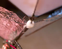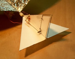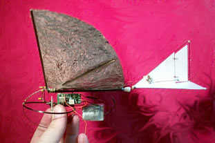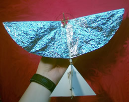 | The picture above shows the overview of the bird (or bat). The wings are aluminumised mylar (from Sams models) and the leading edges are carbon fibre. They were made by splitting a 2mm carbon rod down the middle with a sharp knife like bamboo. The two halves were sanded and tapered to the same weight. The flat of the now half round rod is an excellent gluing surface. The glue used was 3M77 spray adhesive, it sticks like you know what. Occasionally tiny squares of DS tape were used in the field if edges began to peel. The membrane stiffeners are balsa and seem to help although I would like to test that out further. The pivots for the wings are simply brass tube and the carbon rods have piano wire pivots bound to them with Kevar thread (from FreeFlight Supplies). The bumper is made from 3mm wide carbon capping strip (also from FF supplies) Three layers were glued together on a former to make the main vertical bumper, the horizontal one is from two layers added later (now removed). This one has been repaired twice and kevlar added to prevent delamination. The model really bounces with this on and I recommend something like this or similar on any Ornithopter design for use indoors. | |||||||||||||||||