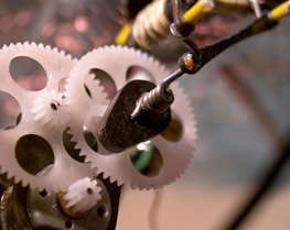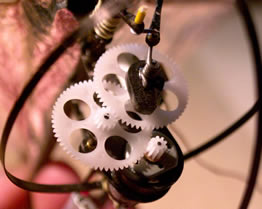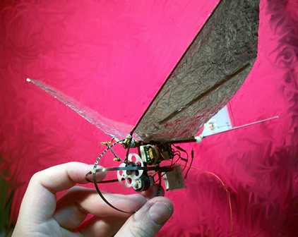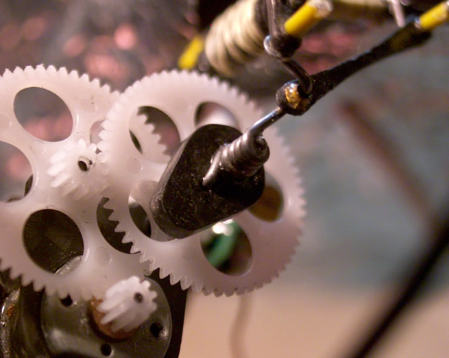 | More pics of the mech. You need to build these like a heli in terms of resilience etc. But that is no so easy at these sizes. Another modification made after the original build was to put 1mm carbon rods between the two plates that make up the gearbox around the locations of the bushes. This prevents the plates pushing together in a crash causing problems with bearing alignment. You can see the double crank quite well here, it allows you to adjust the flaps of each wing but to be honest I left it as I originally made it and used a bit of bluetac on the wing tip to stop the model turning sharply, a suggestion of John Mack. | |||||||||||||||||