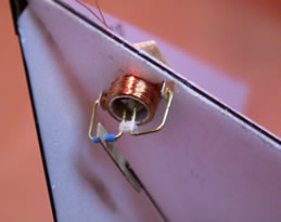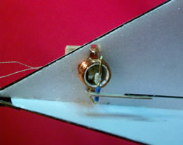 | Before trying more exotic control or going for a servo I decided to try a rudder. I knew Matt had success with is machine using rudder and elevator control so I unplugged the fixed V-tail (used in the partial FF trials) and plugged this one in. It uses an actuator kindly made for me by Peter Frostick that weighs just 1g and is meaty in the torque department. The "long" coil is also said to give more linear torque than some. What I wanted was some beefy rudder action and something that could be mounted in the tail but not on the surface. This fitted the bill. By mounting it in the tail like this the push rod run is completely unaffected by tail trim and of course the surface is also protected by the CF frame. | |||||||||||||||||