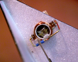 | The side view shows the more of the basic structure. The fuselage tube is carbon braid based tube from Westech. The tail is a 0.5mm carbon frame with 0.5mm Depron covering except for the rudder and stabilizer which is 2mm depron. The frame on the tail is again for protection in the event of crashes, 17g of carbon can fall very heavily indeed. It also protects the actuator nicely. The ball joint that allows the whole tail to be cranked up for trimming purposes can also be seen. This was made from polymorph which is a low temp polymer available from Maplin amongst other places. The ball was rolled in the fingers, allowed to cool and the socket formed over it using more soft polymorph.. The battery has a length of teflon tube taped to it and this slides onto a 1mm carbon rod, this allows CoG adjustment and also helps in crashes. | |||||||||||||||||